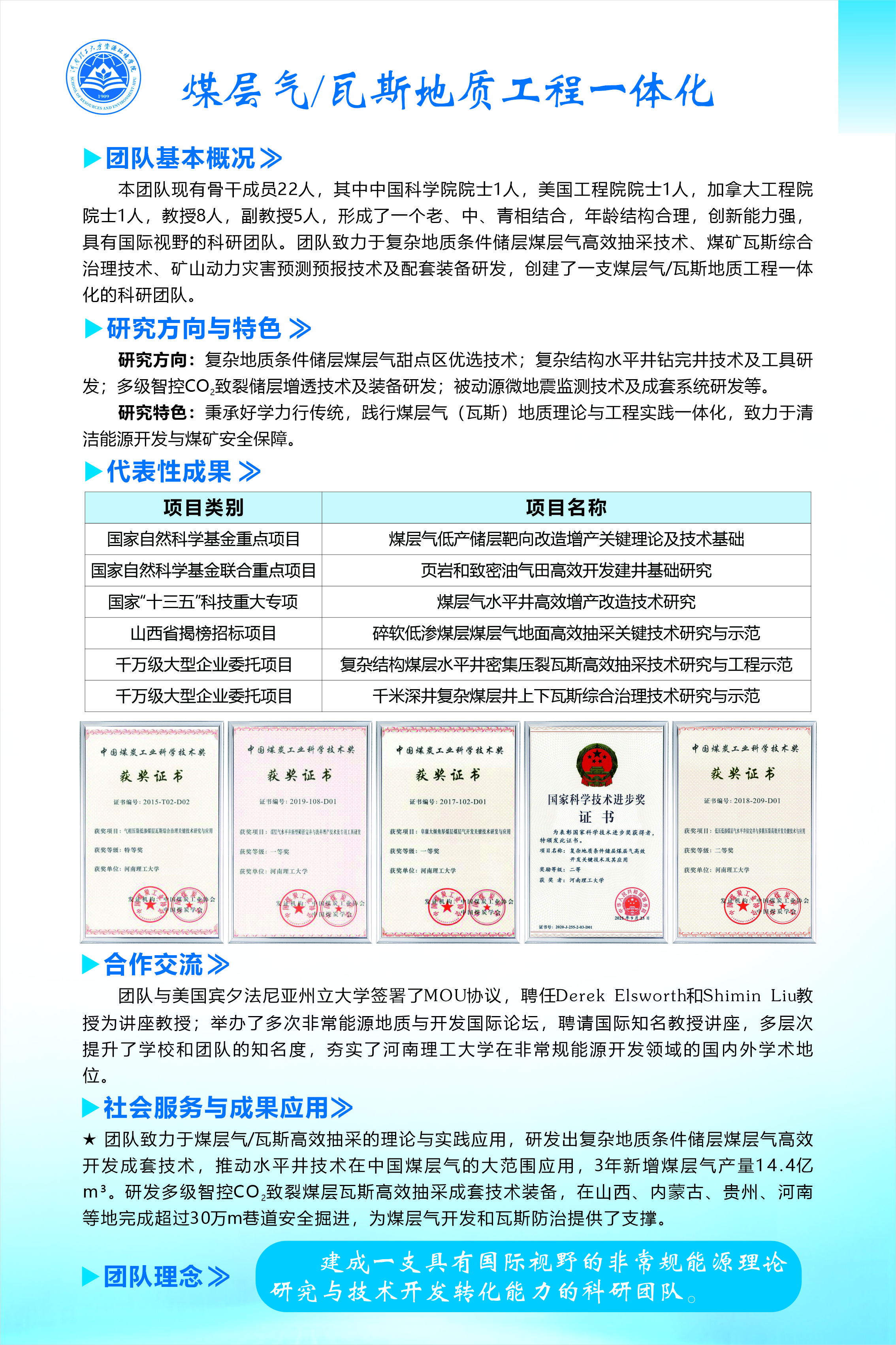 本团队现有骨干成员22人,其中中国科学院院士1人,美国工程院院士1人,加拿大工程院院士1人,教授8人,副教授5人,形成了一个老、中、青相结合,年龄结构合理,创新能力强,具有国际视野的科研团队。团队致力于复杂地质条件储层煤层气高效抽采技术、煤矿瓦斯综合治理技术、矿山动力灾害预测预报技术及配套装备研发,创建了一支煤层气/瓦斯地质工程一体化的科研团队。