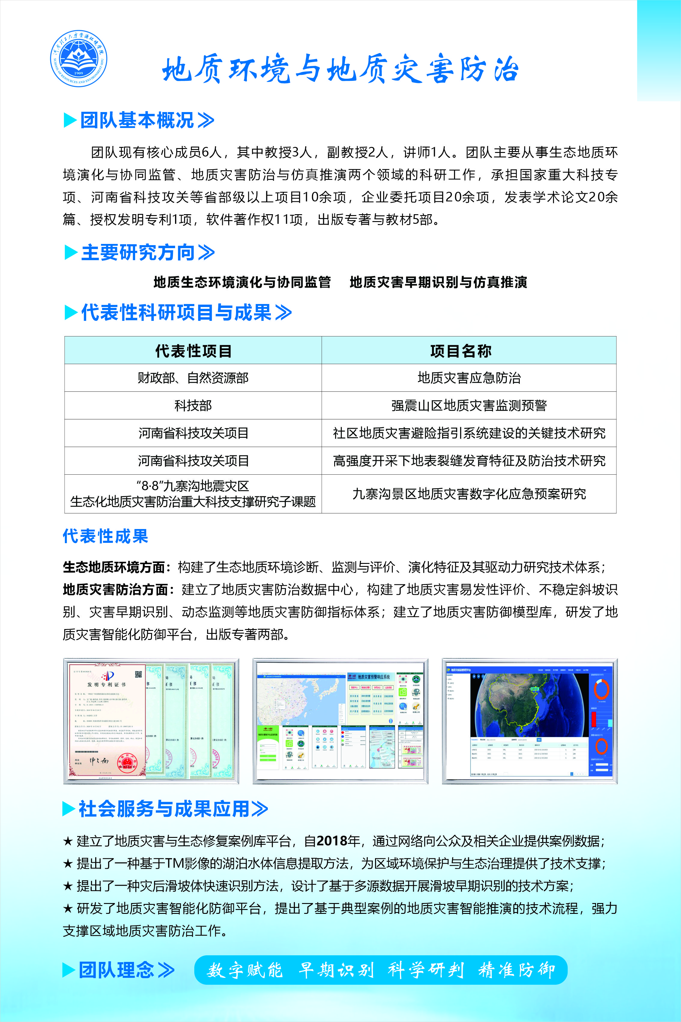 团队现有核心成员6人,其中教授3人,副教授2人,讲帅1人。团队主要从事生态地质环境演化与协同监管、地质灾害防治与仿真推演两个领域的科研工作,承担国家重大科技专项、河南省科技攻关等省部级以上项目10余项,企业委托项目20余项,发表学术论文20余篇、授权发明专利1项,软件著作权11项,出版专著与教材5部。