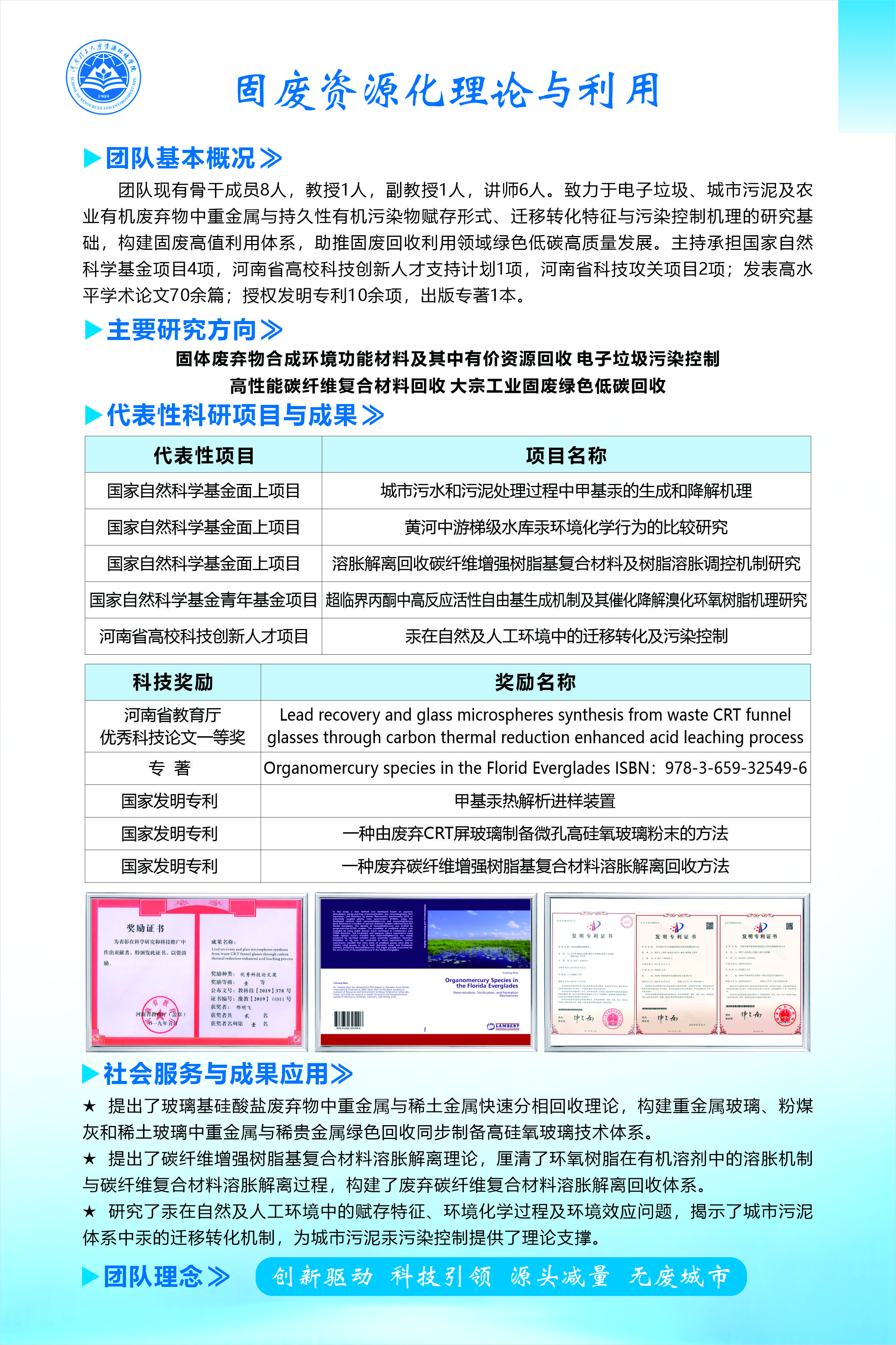 团队现有骨干成员8人,教授1人,副教授1人,讲师6人。致力于电子垃圾、城市污泥及农业有机废弃物中重金属与持久性有机污染物赋存形式、迁移转化特征与污染控制机理的研究基础,构建固废高值利用体系,助推固废回收利用领域绿色低碳高质量发展。主持承担国家自然科学基金项目4项,河南省高校科技创新人才支持计划1项,河南省科技攻关项目2项;发表高水平学术论文70余篇;授权发明专利10余项,出版专著1本。