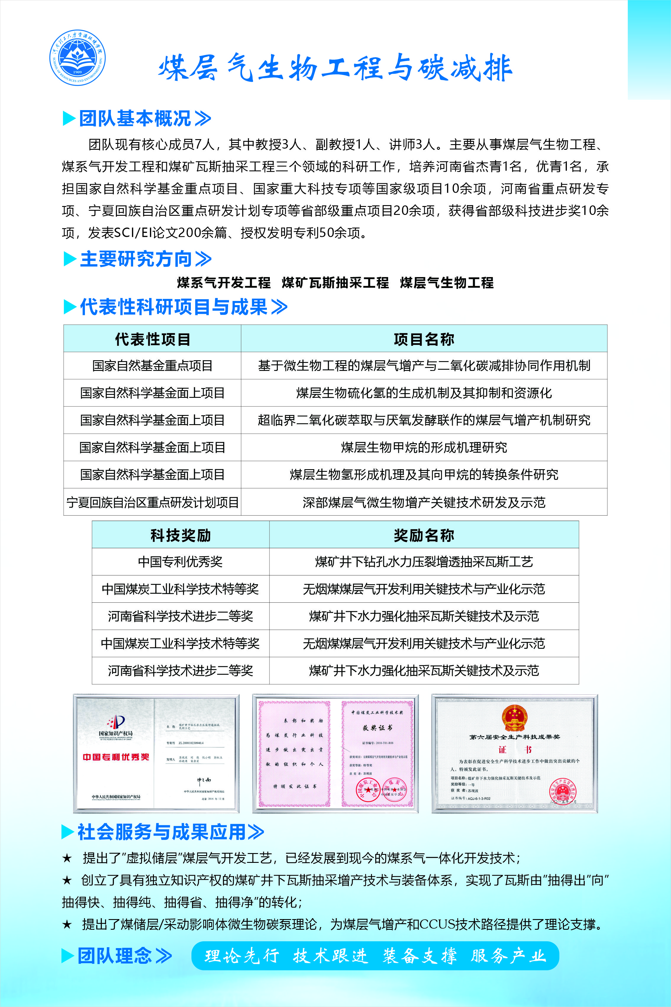 团队现有核心成员7人,其中教授3人、副教授1人、讲师3人。主要从事煤层气生物工程、煤系气开发工程和煤矿瓦斯抽采工程三个领域的科研工作,培养河南省杰青1名,优青1名,承担国家自然科学基金重点项目、国家重大科技专项等国家级项目10余项,河南省重点研发专项、宁夏回族自治区重点研发计划专项等省部级重点项目20余项,获得省部级科技进步奖10余项,发表SCI/EI论文200余篇、授权发明专利50余项。
