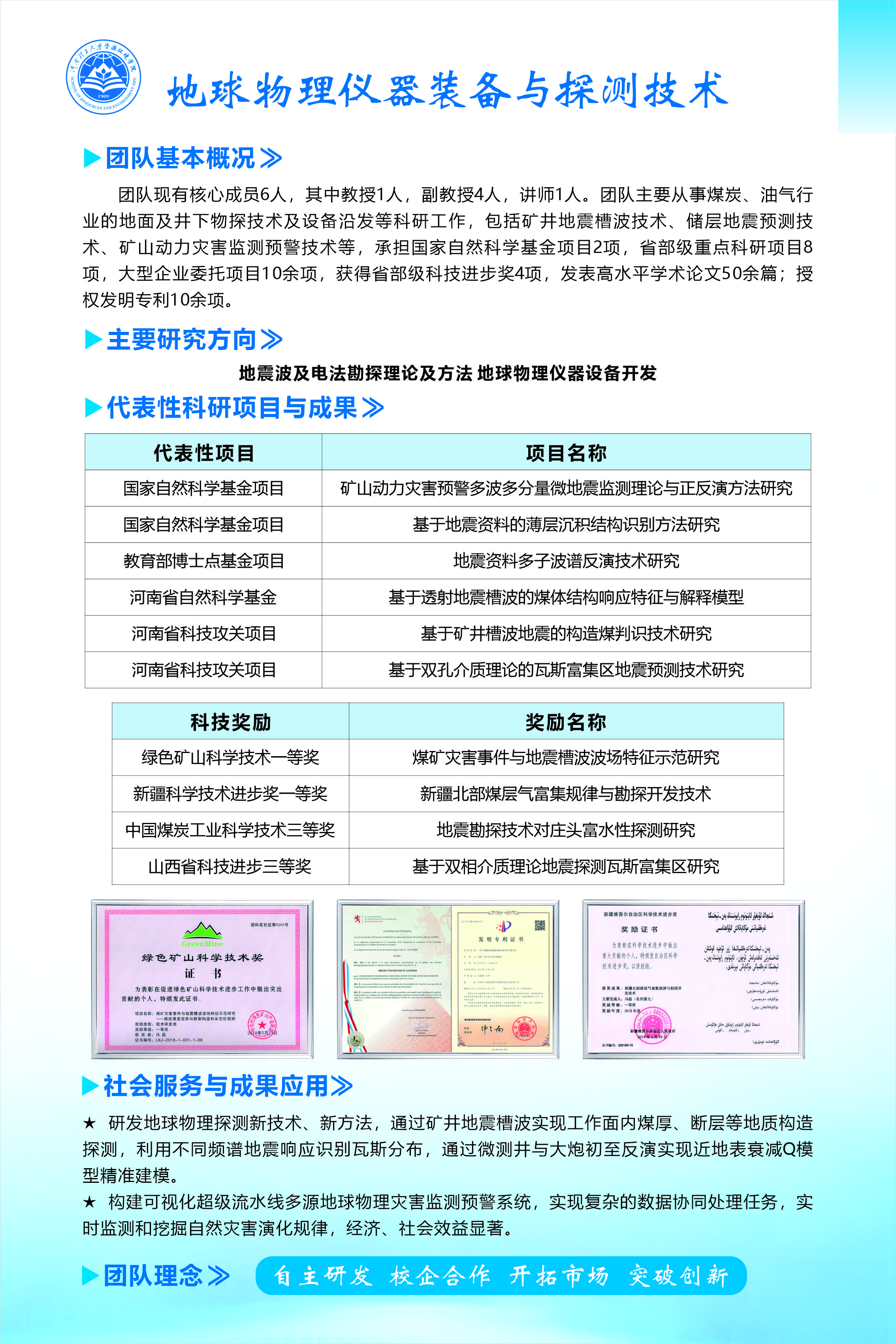 团队现有核心成员6人,其中教授1人,副教授4人,讲师1人。团队主要从事煤炭、油气行业的地面及井下物探技术及设备沿发等科研工作,包括矿并地震槽波技术、储层地震预测技术、矿山动力灾害监测预警技术等,承担国家自然科学基金项目2项,省部级重点科研项目8项,大型企业委托项目10余项,获得省部级科技进步奖4项,发表高水平学术论文50余篇;授权发明专利10余项。